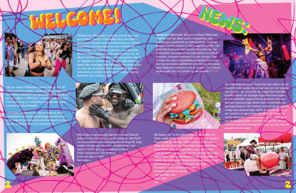 Milkshake is the festival I chose to make a campaign for the in the third project in my first year. There was a list of festivals to choose from and I chose milkshake festival because it suits me very well. It’s bright, it’s fun, it’s whimsical and queer just like me. I created a brand identity and within that identity a logo, an app prototype and a day paper.